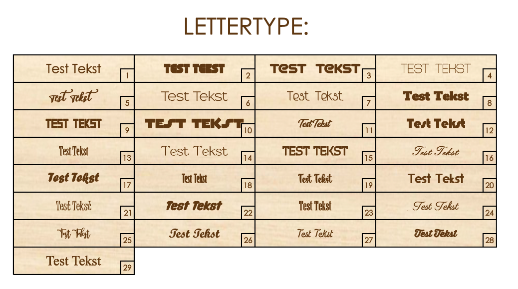 Voeg hieronder voor de naam het nummer van het gewenste lettertype toe (nummers staan vermeld bij de foto)